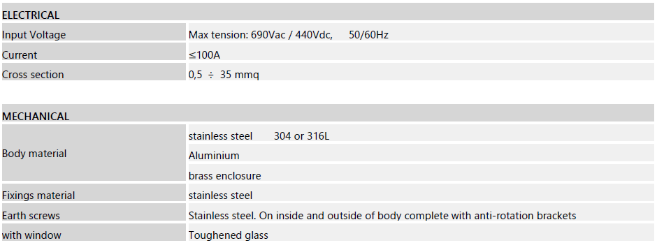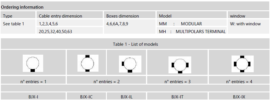 The junction boxes BJX series are normally used to contain terminal blocks and they are recommended for routing and interconnecting the wires at the intersection of the conduits. The wide range offered serve to meet the specific requirements indicated by the custumer. They can be installed in areas classified as 1, 2, 21, 22 zones. The construction characteristics of the BJX