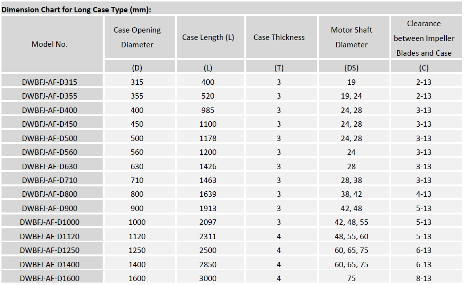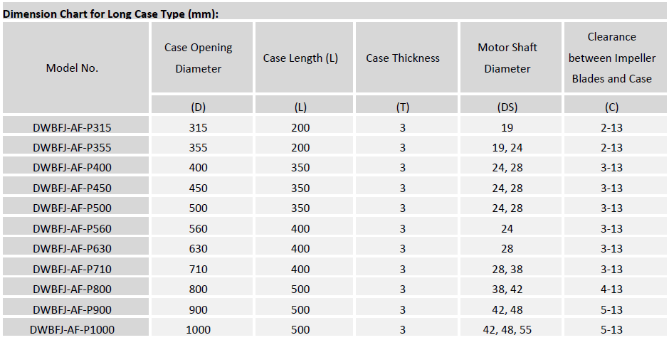 Note 3: Diameter range for short cases is from 315mm to 1000mm.