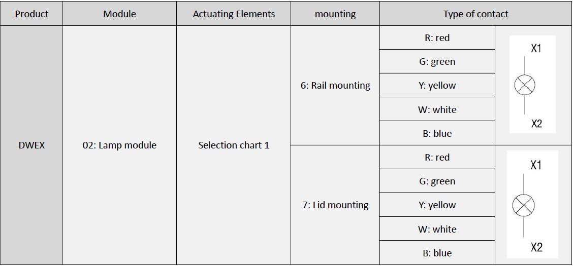 The DWEX02 series lamp module indicates command modesby means of a light signal lighting up or going out. It is suitablefor use in almost all explosive areas in which a visual indication ofa machine’s functional status is required. The lamp module canbe combined with various lamp module actuating elements. Ajunction box is available to facilitate a safe and convenientinstallation of the module into a control panel. The conductorsare connected by means of terminals on the back of the modulewhich have an increased safety level. The lamp module actuatingelements can be fitted easily without tools, which ensuresconformance to the high IP degree of protection.