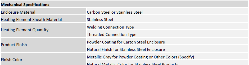All our heaters are designed and manufactured according to customer's requirements and operating conditions. The material for the electrical connection box is carbon steel painted or stainless steel. Heating elements material is stainless steel. The specific surface load is a measure for the heat transfer onto