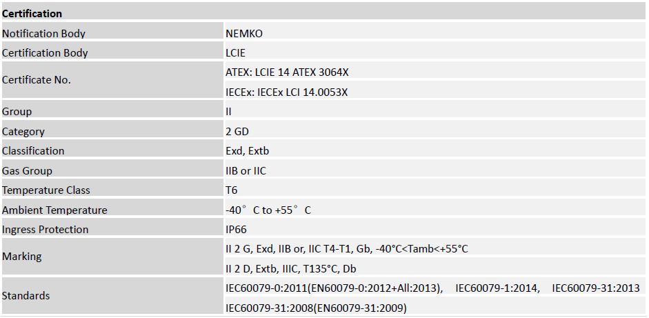 Explosion protected devices are supplied with EC type examination certificate(according to ATEX directive 2014/34/EU), IECEx certificates are available on project basis.