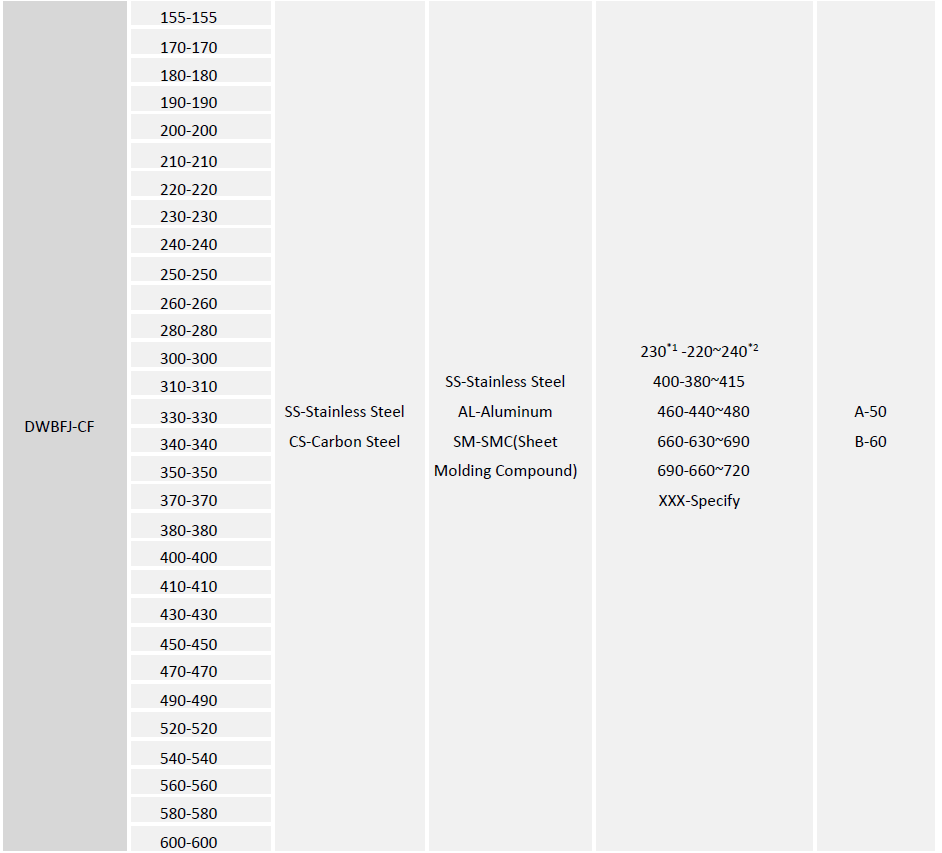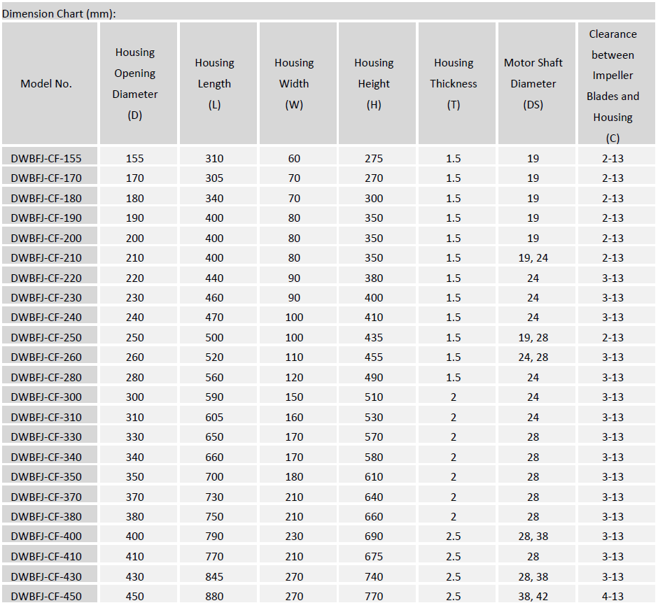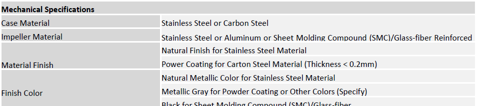 Type DWBFJ-CF centrifugal fan has stainless steel or carbon steel material housing fitted with stainless steel, aluminum or sheet molding compound (SMC) which is also called glass-fiber reinforced polyester (GRP) material