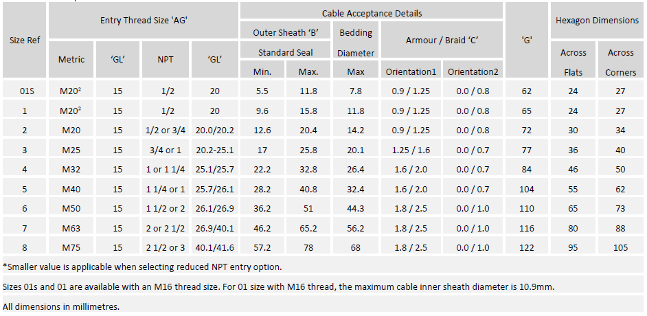 For use with single wire armour ‘W’, wire braid ‘X’, steel tapearmour ‘Z’, elastomer and plastic insulated cables.