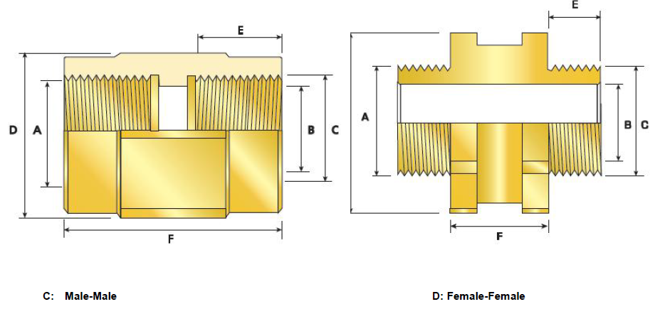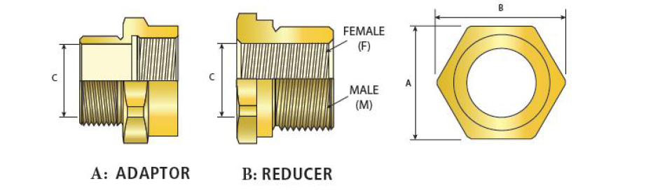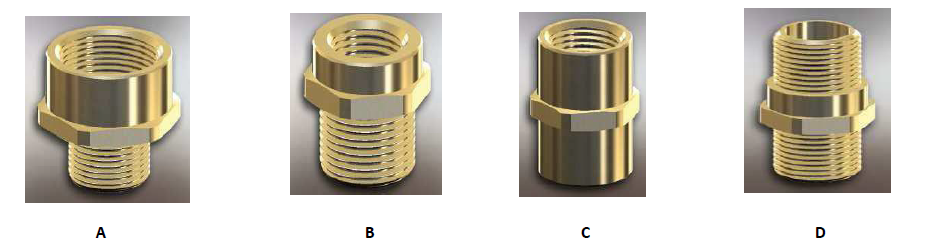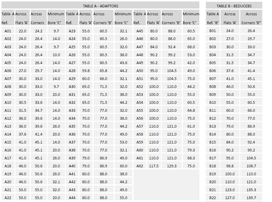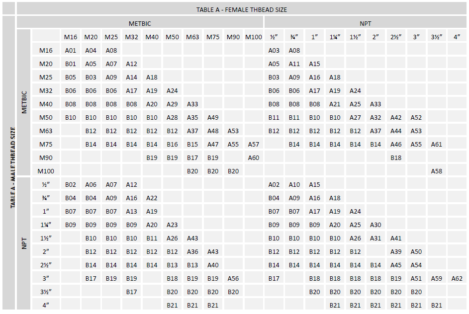 Select the female thread size from the top of Table ‘A’, referenced ‘A**’ for Adaptor and ‘B**’ for Reducer