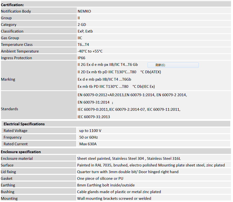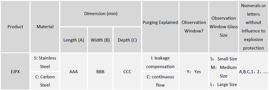 Type EJPX Series Explosion-proof Pressurized Distribution Cabinets consists in pressurized enclosure and Ex p control unit. The pressurized enclosure consists in a cabinet with different enclosure sizes as specified in the manufacturer document and a pressurization system as associated apparatus. The pressurized enclosure is of high quality carbon steel and stainless steel ,Using the sealing strip. The Ex p control unit type will be used to control and verify the minimum over pressure, to perform the purging of the enclosure, to control the purging and pressurization alarm.