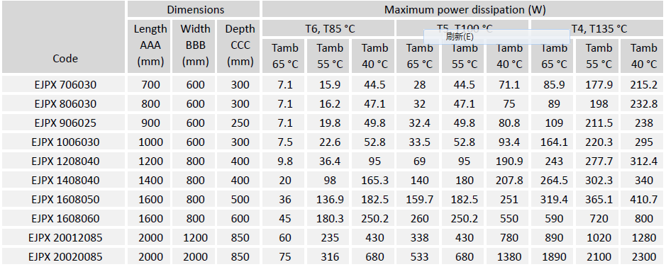 The enclosures may also be manufactured to intermediate sizes. This assumes that any given dimension is not larger than the respective dimension of the largest enclosure or smaller than the respective dimension of the smallest enclosure. The power rating applied to a enclosures of intermediate size is that of the next smallest enclosure.