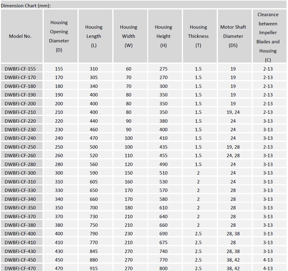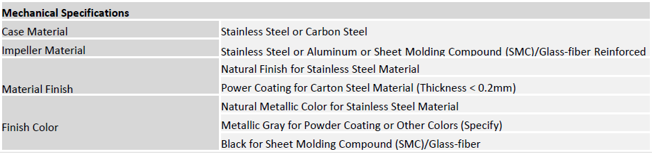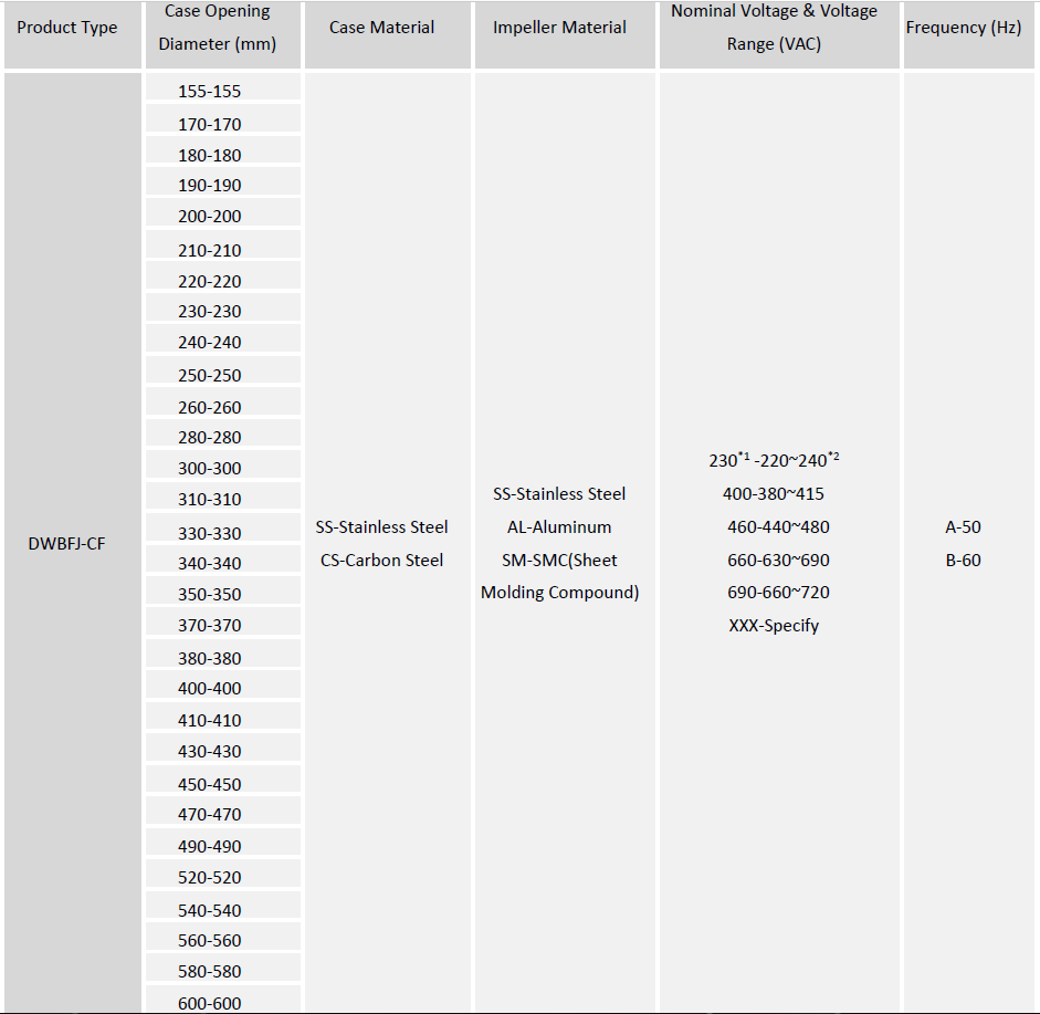 Type DWBFJ-CF centrifugal fan is designed according to EN 14986, EN 13463-1 standards. The product is certified for installation in Zone 1 and Zone 2 for gas environment, Zone 21 and Zone 22 for dust environment.Type DWBFJ-CF centrifugal fan has stainless steel or carbon steel material housing fitted with stainless steel, aluminum or sheet molding compound(SMC) which is also called glass-fiber reinforced polyester (GRP) material impeller. The impeller is backward or forward. The fan is driven directly by an ATEX certified motor.The Ex d motors are equipped with PTC thermistors for optimum motor protection.Three phase , IP55 or IP65,insulation class F, can be frequency conversion motor.