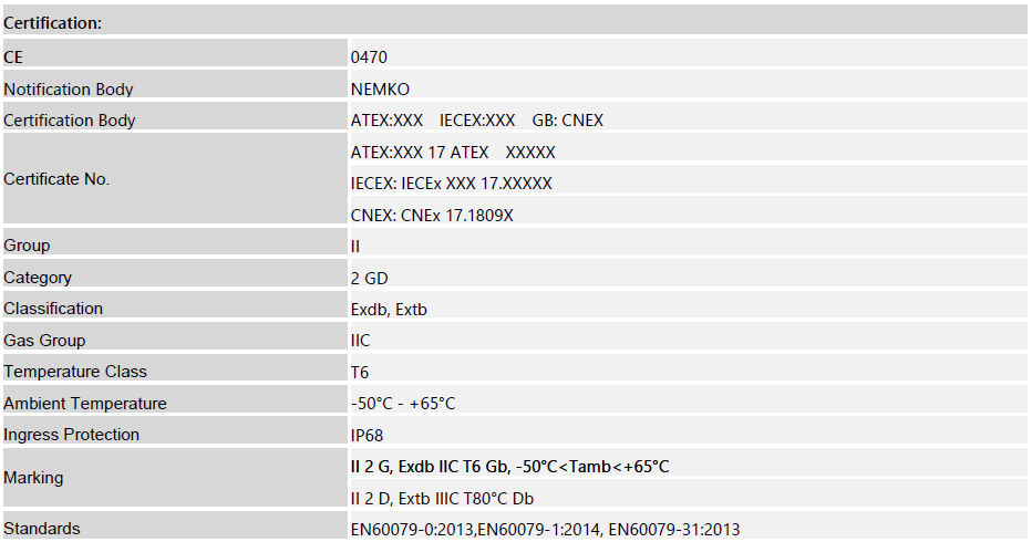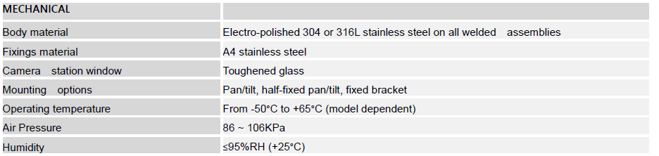 cylinder assembly, front cover, rear cover and inspection window, it’ s applicable for both explosive gas and dust atmosphere. The enclosure is made of S304 or S316L stainless steel with electro-polish finish. The inspection window mounted in the front cover the is made of 10mm thick toughened glass .Within the pressure-resistant enclosure, various camera modules and lenses reflecting different technical specifications.