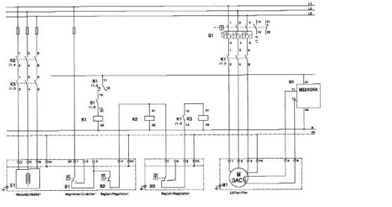 電氣連接應(yīng)根據(jù) EN 60079-14 第 9 節(jié)電纜截面根據(jù)額定電流。 根據(jù)方案, 接線如下圖所示。 通風(fēng)機(jī)的電動(dòng)機(jī)只能通過串聯(lián)的斷路器操作, 并具有跳閘特性。