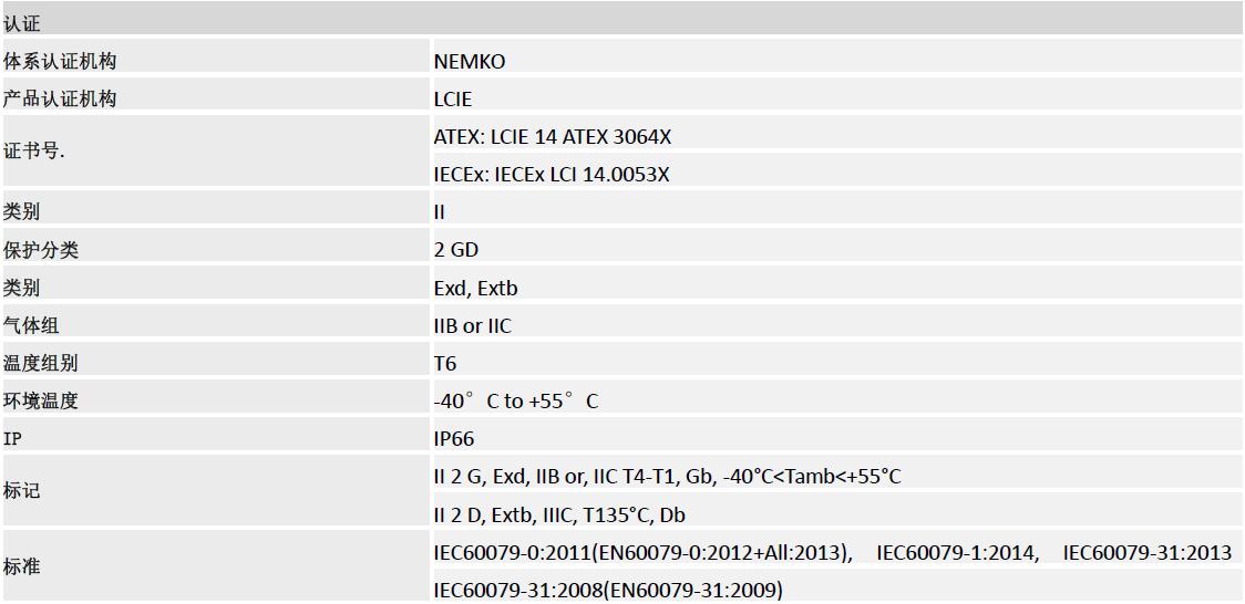 防爆設備 提供 EC 型式檢驗證書( 根據 ATEX 指令 2014 / 34 /歐盟) , IECEx 認證證書。